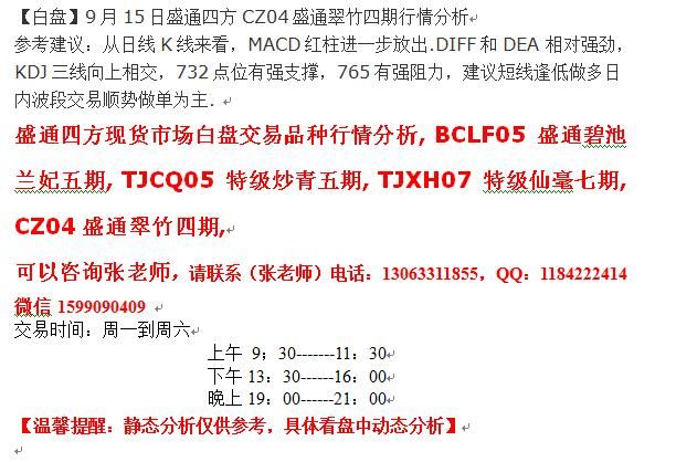 | 【白盘】9月15日盛通四方CZ04盛通翠竹四期行情分析 参考建议:从日线K线来看,MACD红柱进一步放出.DIFF和DEA 相对强劲,KDJ三线向上相交,732点位有强支撑,765有强阻力,建议短线逢低做多日内波段交易顺势做单为主. 盛通四方现货市场白盘交易品种行情分析, BCLF05盛通碧池兰妃五期, TJCQ05特级炒青五期, TJXH07特级仙毫七期, CZ04盛通翠竹四期, 可以咨询张老师,请联系(张老师)电话:13063311855,QQ:1184222414 微信 1599090409 交易时间:周一到周六 上午 9;30-------11:30 下午13:30------16:00 晚上19:00------21:00 【温馨提醒:静态分析仅供参考,具体看盘中动态分析】 ![]() |