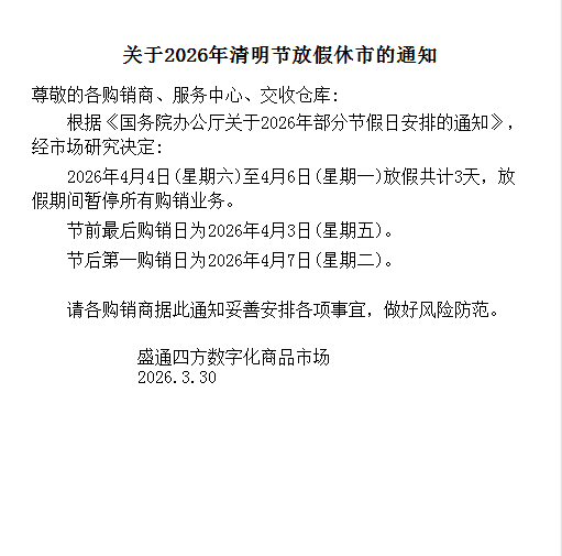 尊敬的各购销商、服务中心、交收仓库: 根据《国务院办公厅关于2026年部分节假日安排的通知》,经市场研究决定: 2026年4月4日(星期六)至4月6日(星期一)放假共计3天,放假期间暂停所有购销业务。 节前最后购销日为2026年4月3日(星期五)。 节后第一购销日为2026年4月7日(星期二)。 请各购销商据此通知妥善安排各项事宜,做好风险防范。 盛通四方数字化商品市场 现货开户咨询QQ 1184222414 电话:13063311855,微信 1599090409 请联系: 张老师 ![]() |
